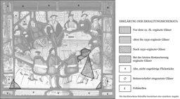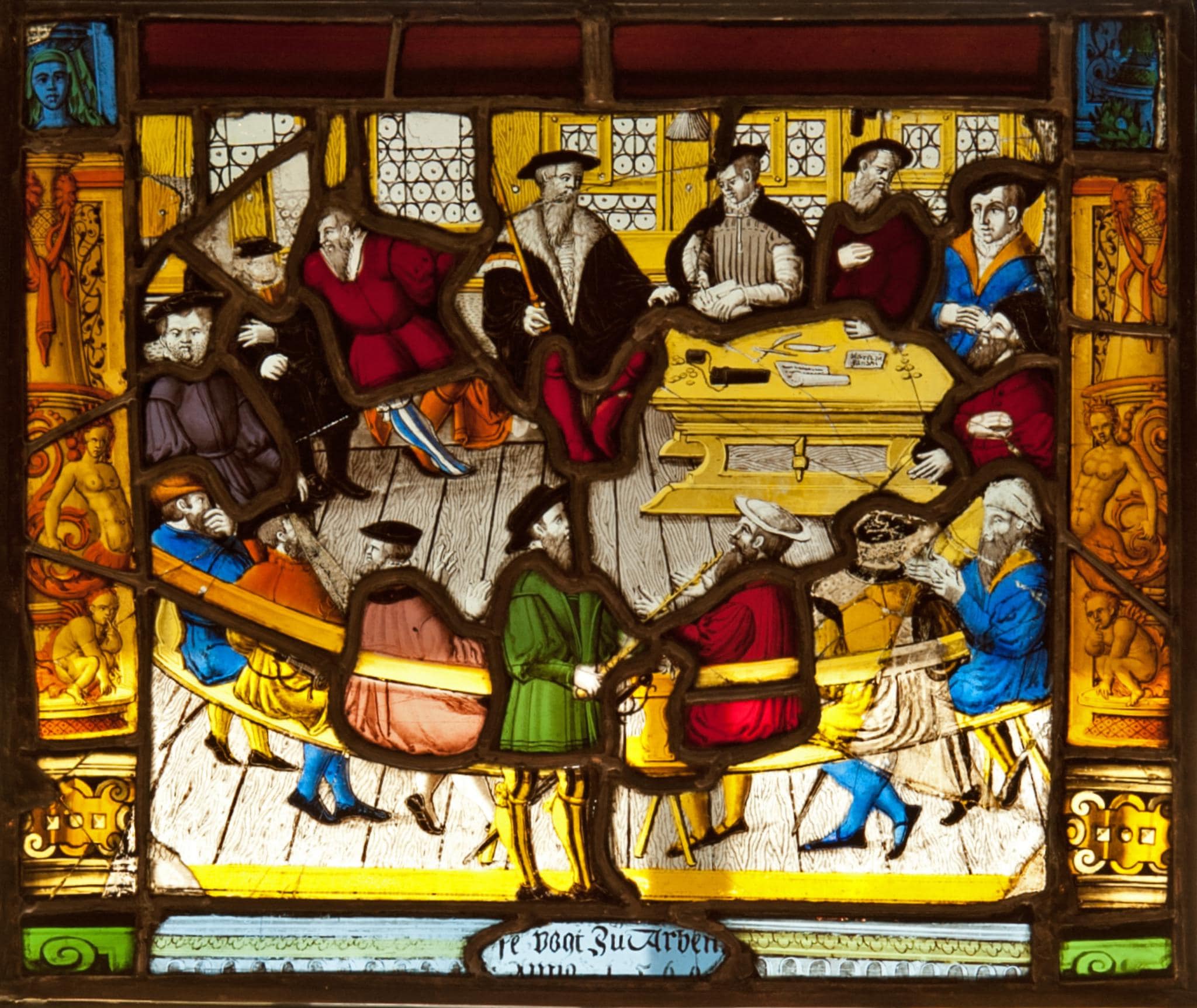 Das Hauptbild zeigt eine mit einem Bretterboden belegte und durch Butzenfenster an der Rückfront erhellte Stube, in der 14 auf zwei langen, kreisförmig angeordneten Bänken sitzende Männer angeregt miteinander diskutieren. Komplettiert wird die Gruppe durch den im Vordergrund stehenden Mann in grüner Kleidung, der sich anhand seines in der rechten Hand gehaltenen Stabes als Weibel zu erkennen gibt. Präsidiert wird die Runde durch die in einen Mantel mit Pelzkragen gehüllte zentrale Figur in der hinteren Reihe, die in ihrer Hand ebenfalls einen Stab hält. Neben ihr sitzt ein Schreiber an einem Tisch, auf dem Münzen, Schreibutensilien und Dokumente liegen. Es dürfte sich demnach um die Darstellung einer Gerichtstagung handeln. Die Szene rahmen seitlich zwei gelbe Pfeiler mit vorgesetzten, figurengeschmückten Balustersäulen, oben ein schlichtes Gebälk und unten eine Zierleiste mit eingefügtem, beschriftetem Flickstück.