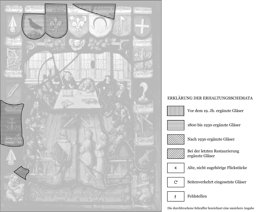 Einige neue Ergänzungen in der Wappenreihe; zahlreiche Sprünge und einige Sprungbleie; die Verbleiung erneuert.
