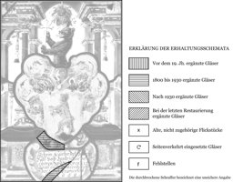 Zwei kleine Stücke der Inschriftenkartusche neu ergänzt; einige Sprungbleie und ein Sprung, die Verbleiung erneuert.