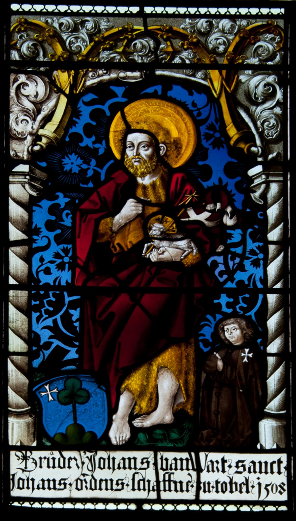 Bannwarts Scheibe von 1508 ist in das nördliche Chorfenster aus dem 19. Jahrhundert integriert. Sie zeigt den auf Wiesenboden vor schwarz-blauem Damastgrund stehenden Johannes den Täufer, einen der Kirchenpatrone sowie den Namenspatron des Stifters und des Johanniterordens. Der in Fellkleidung und einem roten Mantel dargestellte Heilige hält in seiner linken Hand das Lamm Gottes mit der Kreuzfahne. Zu seinen Füssen ist Johann Bannwart kniend in Johanniterkleidung und Gebetshaltung mit seinem Wappenschild festgehalten. Figuren und Wappen umfasst eine Arkade aus spiralig gedrehten Pfeilern und einem Astbogen mit Rankenwerk und sich kreuzenden, doppelt ausgeschweiften Fialen.