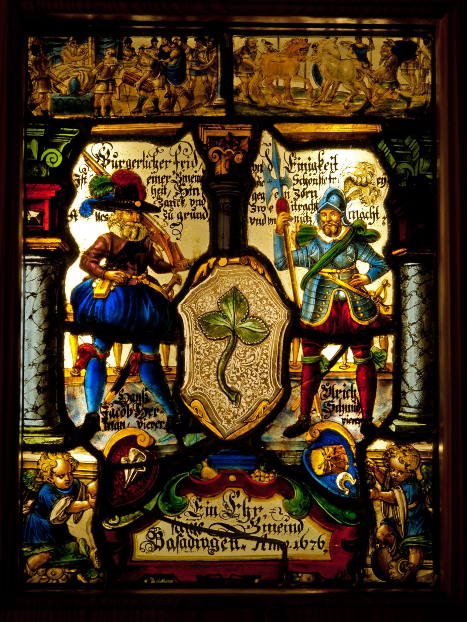 Das Gemeindewappen erhebt sich vor dem Podium, auf dem als Schildbegleiter Hans Jakob Hermann und Ulrich Schmid vor einer niedrigen Balustrade postiert sind. Von den beiden schwertbewaffneten Stiftern erscheint der erstere mit geschulterter Büchse sowie in Pluderhosen, Hemd, Wams und Federhut. Sein Gefährte trägt einen Halbharnisch mit Helm und hält in seiner Rechten eine Hellebarde. Die Wappenschilde beider Männer sind unterhalb von ihnen der von zwei Putten präsentierten Inschriftenkartusche aufgesetzt. Stifterfiguren und Gemeindewappen befinden sich in einer zweiachsigen Säulenarchitektur. Im Oberlicht sind zwei allegorische Figurenszenen festgehalten. Diejenige links schildert die Parabel vom Stäbebrechen, diejenige rechts die Geschichte des Hauptmanns Sertorius.