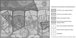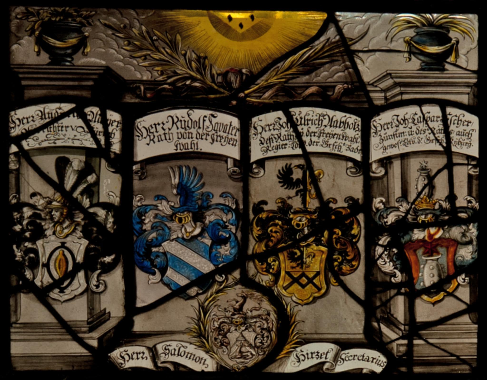 Es existiert ein Rechnungsbeleg für eine von der “Landfriedlichen Kommission” in die Kirche gestiftete Scheibe (Erni/Raimann, 2009, S. 210). Peter Erni und Alfons Raimann vermuten, dass es sich dabei um das vorliegende Glasgemälde handelt. Die betreffende Kommission wurde nach dem zweiten Villmergerkrieg beim 1712 vollzogenen Abschluss des vierten Landfriedens zur Überwachung der konfessionellen Parität und zur friedlichen Beilegung künftiger Streitigkeiten eingesetzt. Darin vertreten waren die evangelischen Stände Zürich und Bern sowie die katholischen Luzern und Uri mit je einem Mitglied. Die vorliegende Scheibe kann demnach unmöglich diese Kommission repräsentieren, handelt es sich doch bei ihren Stiftern durchwegs um Ratsangehörige aus Zürich. Sie dürfte demnach mit der in der Literatur als verschollen bezeichneten Ratsscheibe Zürichs identisch sein, auf der acht Wappen dortiger Ratsherren sowie dasjenige des Ratsschreibers (Sekretärs) zu sehen waren (Leutenegger, 1924). Sie muss mit anderen Worten ursprünglich vier weitere, in einer separaten Reihe angebrachte Ratswappen enthalten haben. Darauf dass sie in ihrer heutigen Form ein Fragment bildet, weisen ihre Masse (27 x 33.2 cm). Rechnet man die abhanden gekommene Wappenreihe von ungefähr 14 Zentimetern Höhe hinzu, dann wird sie einstmals nämlich die gleichen Masse wie die Standesscheibe Zürichs sowie diejenigen Berns und St. Gallens (ca. 41 x 32 cm) besessen haben.