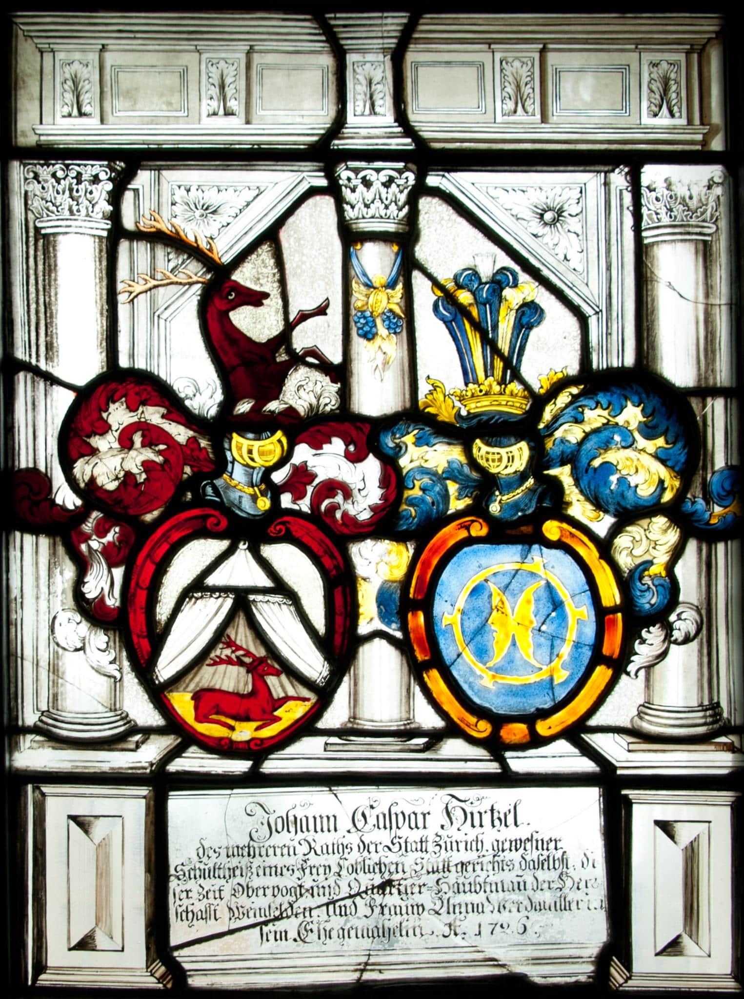 1726 wurde die paritätische Kirche von Weinfelden parallelchörig ausgebaut. Dazu lieferte nicht nur die Stadt Zürich als Herrschaftsherrin, sondern auch deren dortiger Obervogt Hans Kaspar Hirzel eine ansehnliche Beisteuer. Gleichzeitig verehrte dieser dorthin seine vorliegende Allianzwappenscheibe. Als für die Reformierten 1902/03 anstelle der Kirche von 1726 der heutige Zentralbau errichtet wurde, übernahm man dorthin Hirzels Glasgemälde aus dem Vorgängerbau. Laut der Publikation der Kirchenbaukommission von 1905 wurden damals mehrere Glasgemälde aus der alten Kirche in den Neubau übernommen, heute ist jedoch nur noch eines an Ort erhalten.