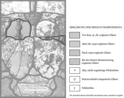Die Helmzier des Wappens Zollikofer sowie das unterste Stück in der Helmzier des Von Watt-Wappens neu ergänzt; die blaue Schmelzfarbe stellenweise ausgebrochen; Schäden in der Schwarzlotbemalung; mehrere dünne Sprungbleie; die Verbleiung erneuert.