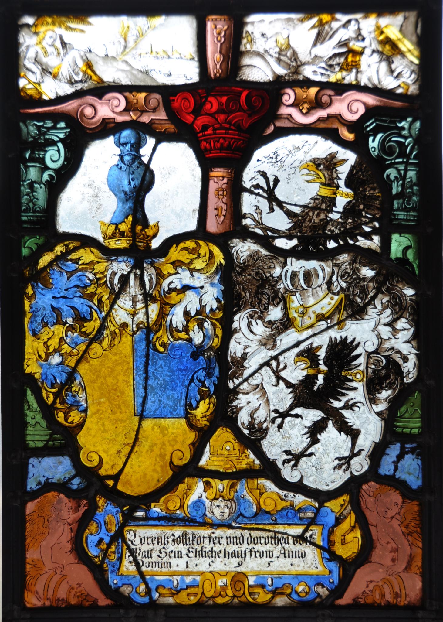 Hasler, R., & Keller, S. (2020). Allianzwappenscheibe Lorenz (Laurenz) Zollikofer und Dorothea von Watt. Dans Vitrosearch. Consulté le 5 décembre 2025 de https://vitrosearch.ch/objects/2658210.