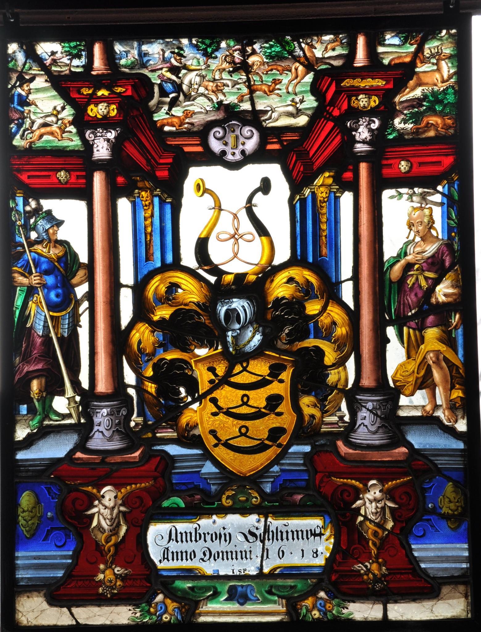 Das Vollwappen Schlumpf befindet sich im Zentrum eines perspektivisch stark verkürzten architektonischen Gehäuses, das sich vor farblosem Grund auf einem hohen blauen Podium erhebt. Zwei lachsfarbene schlanke Säulen auf roten, mit Tiermasken verzierten Postamenten stützen das zurückfluchtende rote Gebälk, das an der Rückfront auf blauen Pilastern ruht. Vor den beiden Seitenöffnungen des Gehäuses sind zwei allegorische Frauengestalten als Schildbegleiterinnen postiert. Während von diesen die Erstere in violettem Gewand, blauem Brustpanzer und Helm sowie mit einem Speer in der Hand erscheint, trägt die Letztere ein gelbes Untergewand und eine violette Tunika sowie auf dem Kopf als ihr Attribut eine Taube mit Palmzweig im Schnabel. Sie verkörpert demnach die Pax und ihr Gegenüber die Victoria. Die Tafel mit dem Stifternamen (Flickstück) ist unten am Podium zwischen den Säulenpostamenten platziert. Im Oberbild sind in offener Landschaft Reiter mit ihren Gehilfen und Hunden bei der Hirsch und Rehjagd dargestellt.