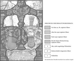 Die Vollwappen Joachim Zollikofers und Katharina Seuters sind vor farblosem, schnurverziertem Grund auf das blaue Podium am Scheibenfuss gestellt. Vor diesem befindet sich die Stifterinschrift in einer gelben, mit zwei barbusigen, geflügelten Wesen dekorierten Rollwerkkartusche. Hinter den Schilden erhebt sich eine zweiachsige Rahmenarchitektur aus roten Rundpfeilern und einem roten Flachbogen mit einer grossen, maskengeschmückten Scheitelkartusche. Das durch die Kartusche in zwei Felder unterteilte Oberbild zeigt ein Reiterheer, das gegen eine es unter Beschuss nehmende Truppe von Fusssoldaten anstürmt. Über der Helmdecke des Wappens Seuter ist im weissen Grund eine Fliege als Trompe-l'œil festgehalten.