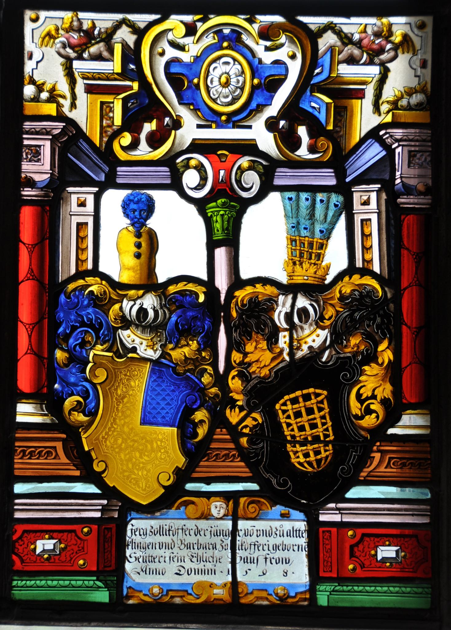 Die Vollwappen Georg Zollikofers und Barbara Seuters befinden sich im Zentrum eines bunt gestalteten, zweiachsigen architektonischen Gehäuses. Sie erheben sich über der noch originalen Inschriftenkartusche mit dem Monogramm des Konstanzer Glasmalers Caspar Spengler.