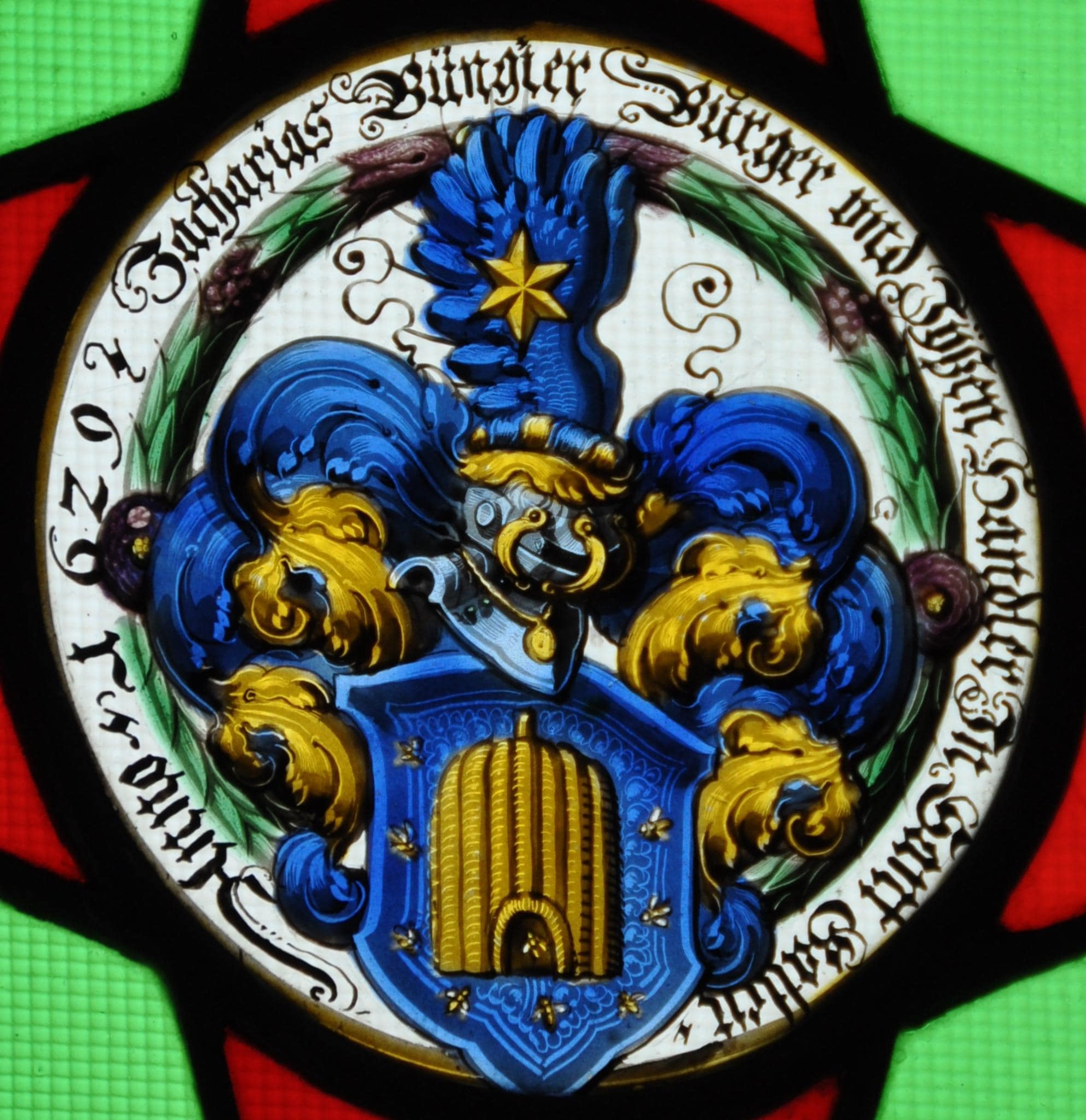 Zacharias II. Bungier (1602–1666) war der Sohn von Anna Scherlin von Arbon und Zacharias I., der sich 1599 in St. Gallen eingebürgert hatte. Wie sein Vater den Zinngiesserberuf ausübend, amtetet er in St. Gallen als Meister der Schmiedenzunft (Historisch-biographisches Lexikon der Schweiz, 2/1924, S. 433). 1640–1666 war er Zinngiessprobierer und 1654 Goldschmiedprobierer (Schweizerisches Künstlerlexikon, 1905). Laut der Stifterinschrift seiner Scheibe betätigte er sich zudem als Eisenhändler. Sein Glasgemälde und dasjenige seiner Gemahlin Susanna Högger (TG_161) gehören zusammen, d.h. sie wurden von diesem Ehepaar für den gleichen unbekannten Ort in Auftrag gegeben.