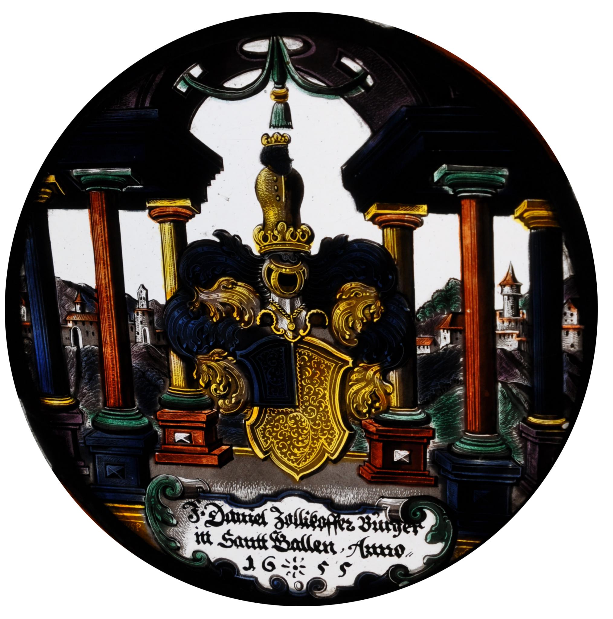 Hasler, R., & Keller, S. (2020). Runde Wappenscheibe Daniel Zollikofer. Dans Vitrosearch. Consulté le 5 décembre 2025 de https://www.vitrosearch.ch/objects/2658842.