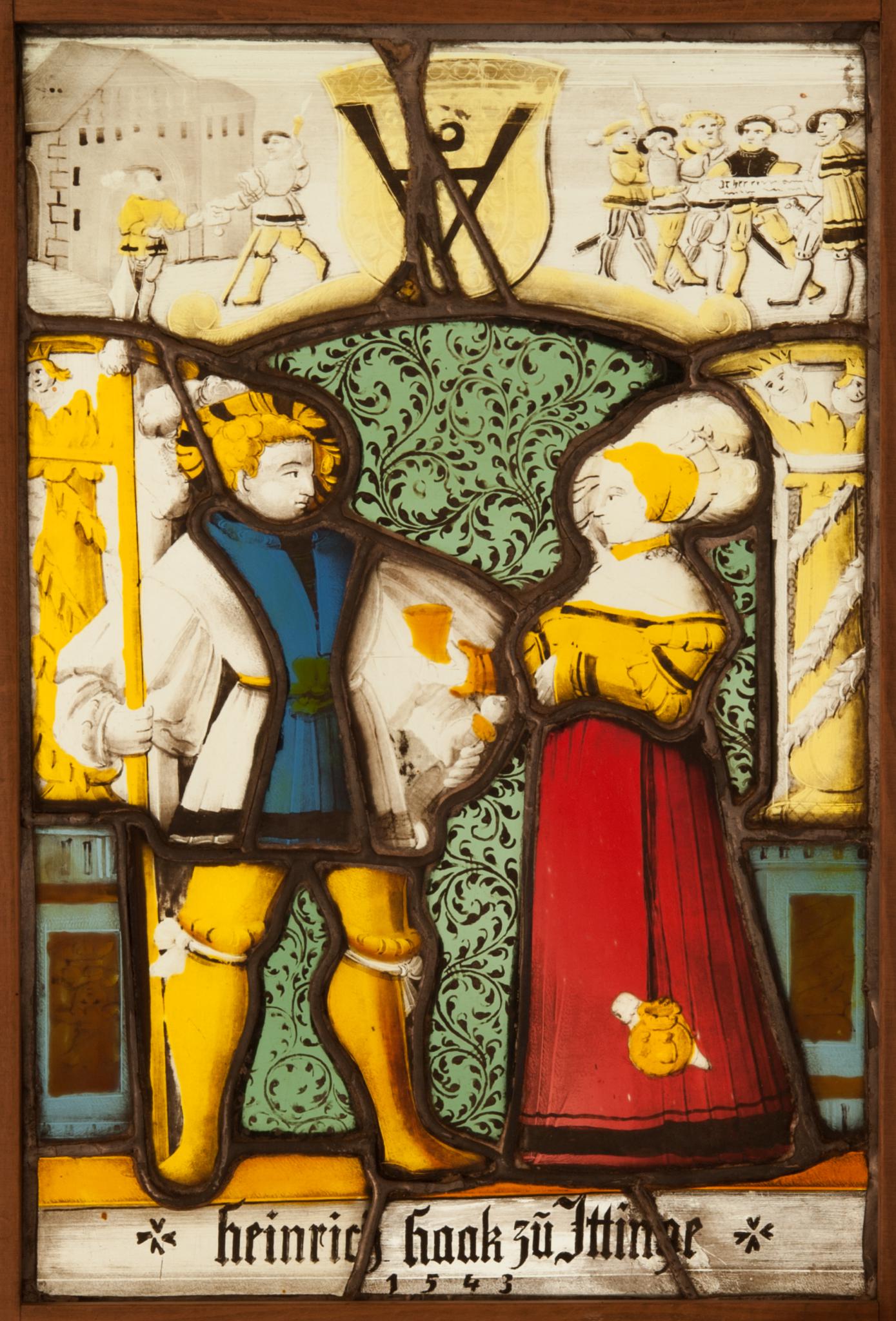Vor grünem Federdamastgrund steht sich auf dem beschrifteten Podium das Stifterehepaar gegenüber. Der Mann in weissem Wams, blauem Hemd, gelben Beinkleidern und Federbarett hält in seiner Rechten einen Speer, in seiner Linken den Dolch. Seine einen roten Rock und ein gelbes Mieder tragende Gemahlin reicht ihm mit der rechten Hand den Becher mit dem Willkommtrunk. Seitlich rahmen die Figuren zwei Säulen auf hohen Postamenten. Darüber wölbt sich ein Astbogen. Im linken Teil des Oberbildes ist festgehalten, wie ein Speerträger, vermutlich ein Bote, einem vor einem Gebäude stehenden Mann ein Dokument mit Siegel übergibt. Im rechten Teil ist eine Gruppe bewaffneter Männer um ein entrolltes Dokument postiert. Zwischen beiden Szenen befindet sich das Wappen des Stifters.