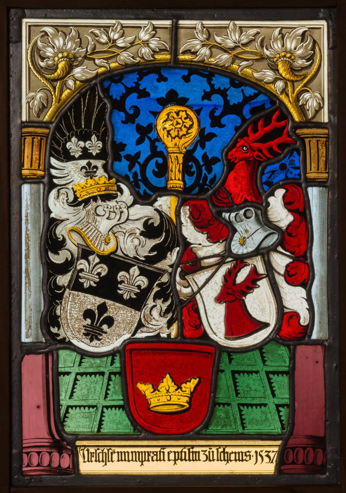 Das Glasgemälde wird von Büchi (1890) irrigerweise ins Jahr 1517 datiert. Es kann jedoch frühestens 1528 entstanden sein, als Ursula II. Muntprat von Spiegelberg ihr Amt als Äbtissin von Schänis antrat. Sein noch fast rein spätgotischer Charakter lässt den Schluss zu, dass sie diese in ihrer frühen Amtszeit in Auftrag gab, das heisst wohl früher, als es die erneuerte Jahresangabe 1537 suggeriert.