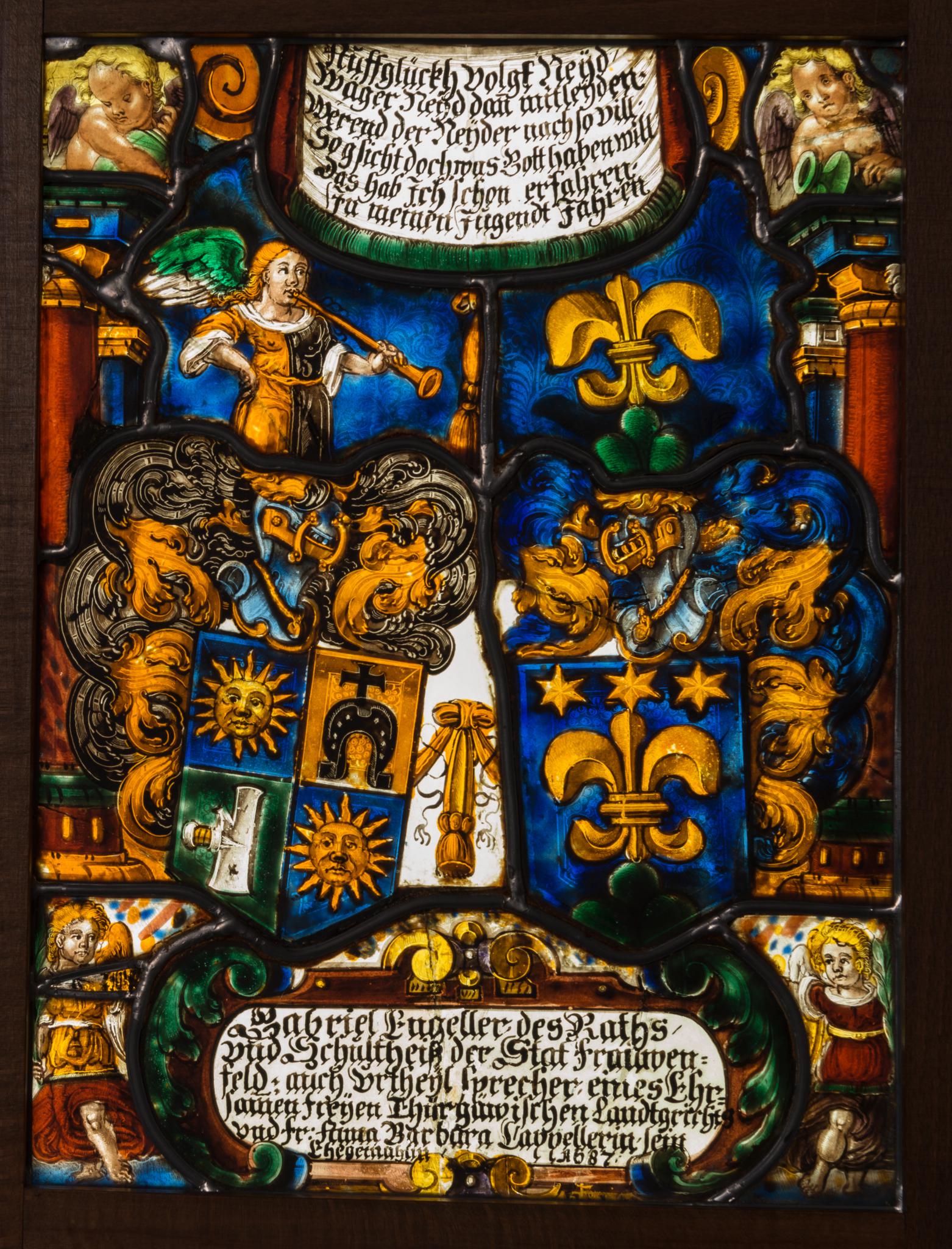 Gabriel Engeller, des Raths / vnd Schůltheiβ der Stat Frauwen= / feld: auch vrtheÿl sprecher eines Ehr= / samen Freÿen Thürgäwischen Landtgerichts / vnd Fr: Anna Barbara Cappellerin sein / Ehegemahlin 1687.