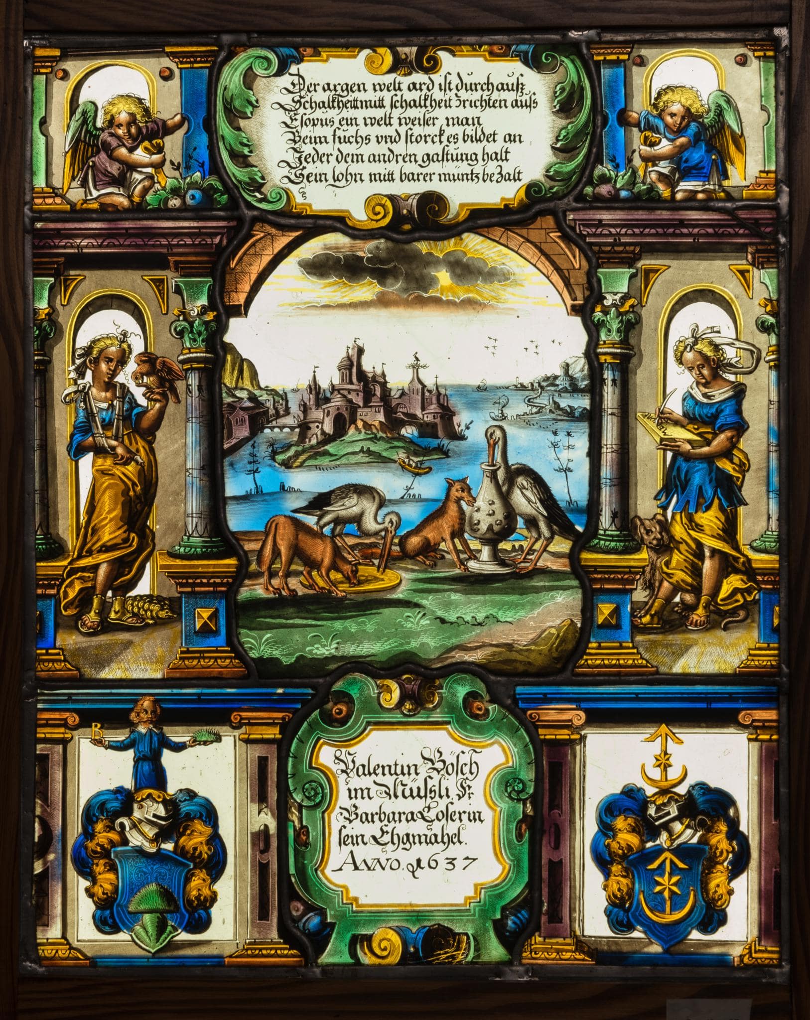 Eine dreistöckige frühbarocke Rahmenarchitektur unterteilt die Scheibe in mehrere Bildfelder. Im Mittleren und Grössten davon ist nach Christoph Murers Emblem XXXIII die der Schalkheit gewidmete Aesop'sche Fabel vom Storch und Fuchs dargestellt. Darin wird geschildert, wie ein Fuchs einen Storch zu Gast empfing und ihm leckere Speisen vorsetzte, allerdings ganz bewusst nur auf sehr flachen Schüsseln, so dass dieser mit seinem langen Schnabel davon nichts fressen konnte. Am nächsten Tag lud der Storch den Fuchs zum Mahle ein und tischte auch ihm Leckerbissen auf. Aus Rache offerierte er diese aber in langhalsigen Gefässen, in die der Fuchs sein Maul nicht stecken konnte, während der Storchenschnabel damit kein Problem bekundete. Exakt in der Form von Murers Emblemradierung des Jahres 1622 zeigt das Scheibenmittelbild die beiden zum Mahle vereinten Kontrahenten vor einer fantasievollen See- und Insellandschaft, einmal bei der flachen Schüssel und einmal beim langhalsigen Gefäss. Die Erläuterung dazu liefert der Text zu Murers Emblem XXXIII, der sich in der oberen, von zwei Putten mit Früchtebouquets begleiteten Kartusche befindet. Seitlich des Hauptbildes stehen in Nischen zwei ebenfalls auf Vorlagen Murers zurückführbare (s.u.) allegorische Frauengestalten. Diejenige links mit dem Vogel, dem Arm in der Schlinge und dem eingebundenen Finger versinnbildlicht den Tastsinn (Tactus) und diejenige rechts mit dem Hund und der Schrifttafel das Gedächtnis (Memoria). Die Fusszone füllt die von den beiden Stifterwappen flankierte Rollwerkkartusche mit den Namen Valentin Böschs und Barbara Losers.