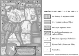 Vor farblosem Grund mit Fruchtgehänge und Blumenvase steht sich ein Stifterpaar gegenüber. Der bärtige Mann in grünen Beinkleidern, rotem Hemd, gelbem Wams und schwarzem Federhut hat seine Büchse geschultert und das Patronenbandelier um die Brust gelegt. Seine Gemahlin in weissem Plissékleid, rotem Rock mit blauen Streifen und weisser Haube bietet ihm in ihrer Rechten den Willkommtrunk in einem prächtigen Pokal an, während sie in der Linken ihre Handschuhe hält. Die Rahmenarchitektur um die beiden Figuren ist mehrheitlich aus alten Flickstücken zusammengesetzt.