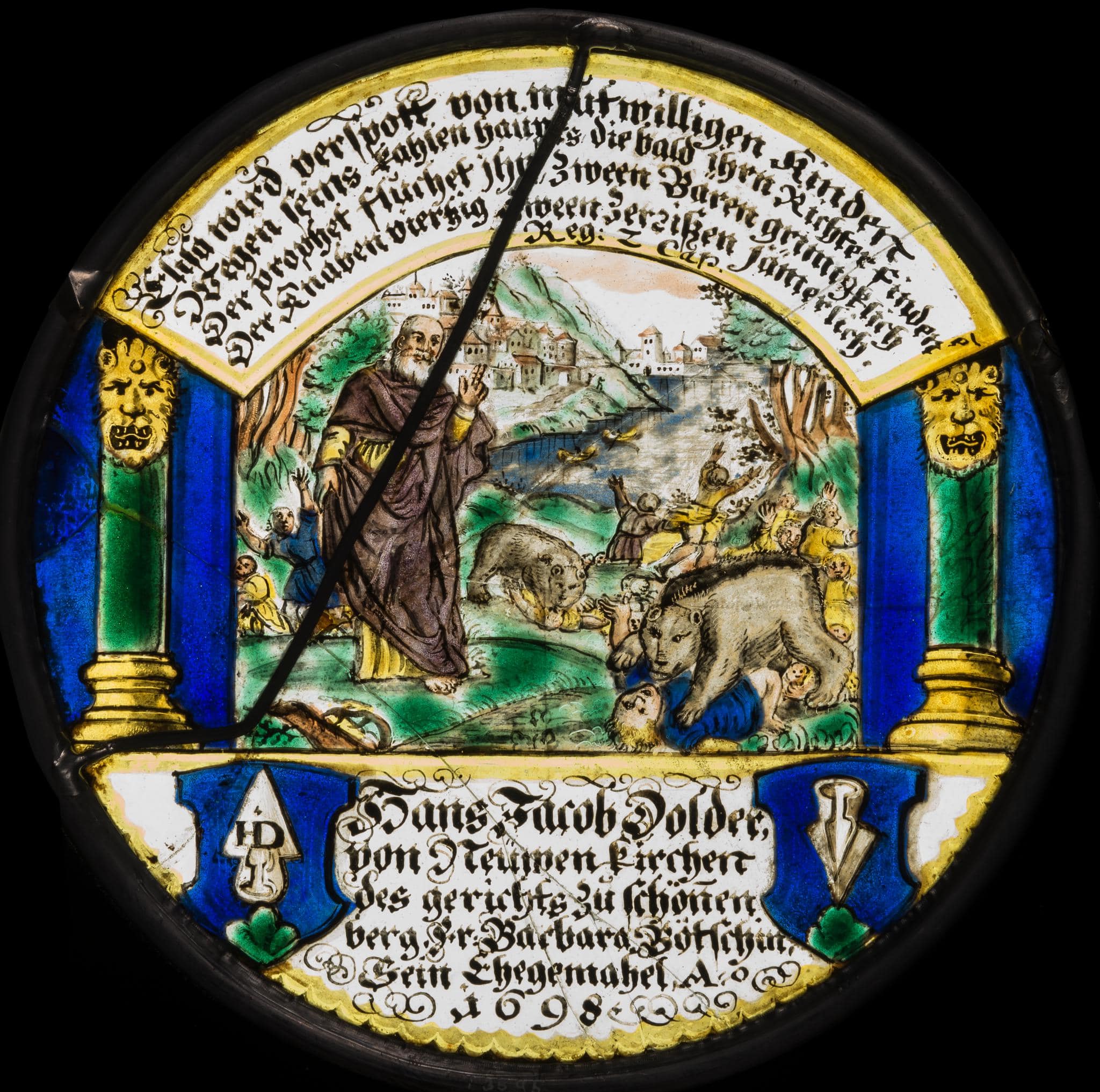 Das Hauptbild zeigt Elisa, den Jünger des Propheten Elisa, sowie die Knaben von Bethel, die ihn verspottet hatten und deshalb auf göttliches Geheiss von Bären zerrissen werden (2 Kg 2, 23f.). Die Szene rahmen zwei mit Löwenköpfen versehene Säulen, über denen sich in einer tonnenförmigen Tafel die Bildlegende befindet. Den Scheibenfuss füllt die von den Wappen Hans Jakob Dolders und Barbara Bötschs flankierte Stifterinschrift.