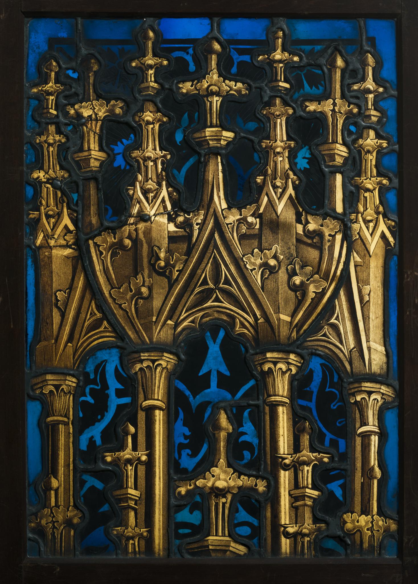 Farbiges Glas; Bemalung mit Schwarzlot.