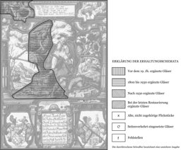 Mehrere neue Ergänzungen und ein altes Flickstück; zahlreiche Sprünge und Sprungbleie; die Verbleiung erneuert.