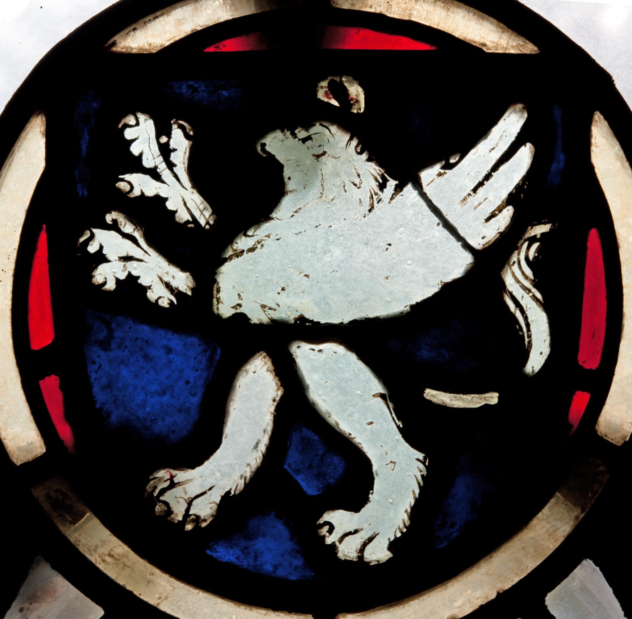Das alte Wappenfragment mit dem Greifen befindet sich in einer neuzeitlichen runden Einfassung.