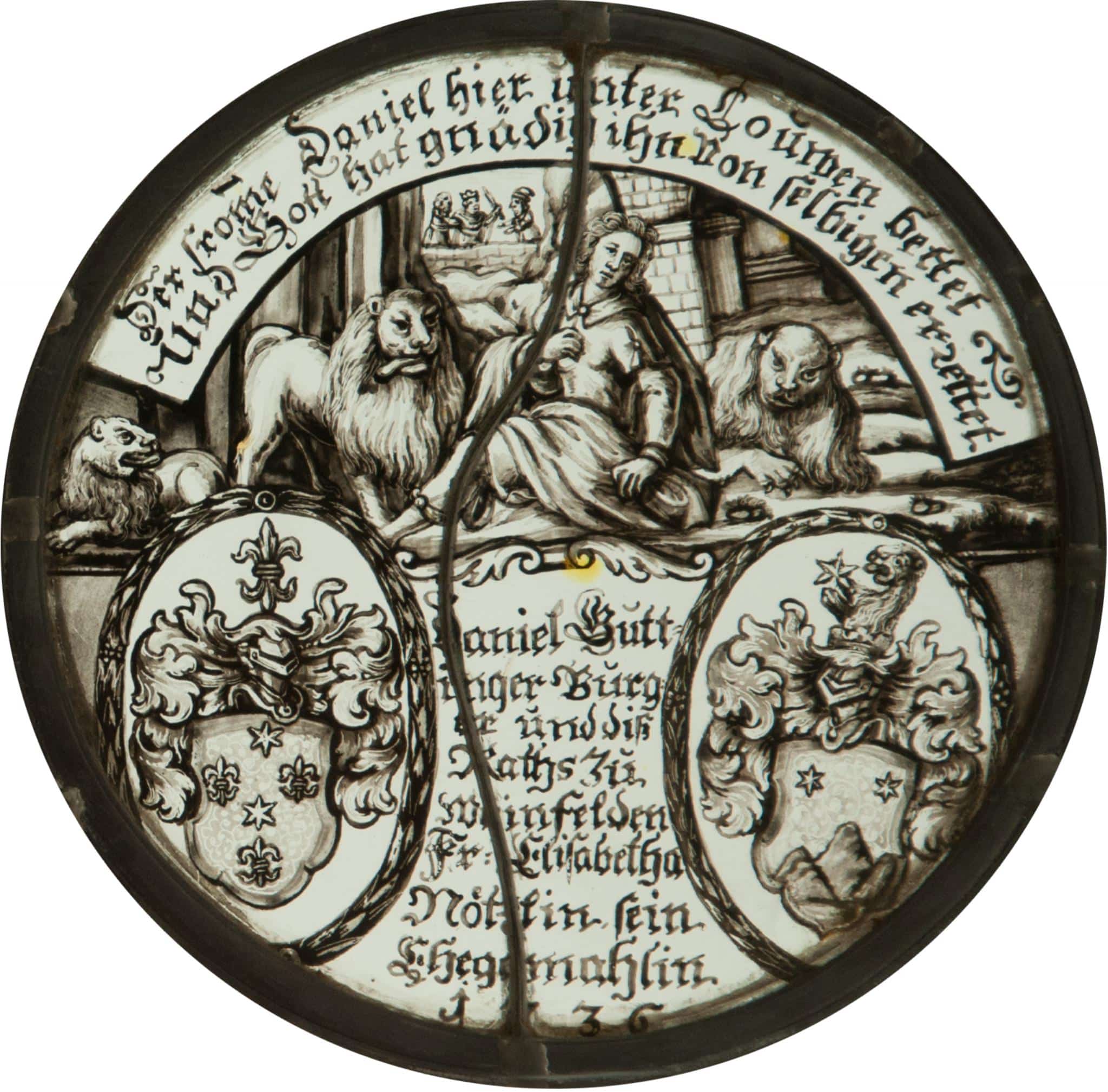 In der oberen Scheibenhälfte ist Daniel in der Löwengrube festgehalten. Die Bildlegende dazu befindet sich in der darüber angebrachten Schriftrolle. Die untere Scheibenhälfte füllen die Stifterinschrift und die sie flankierenden, oval umkränzten Vollwappen von Daniel Güttinger und seiner Gemahlin.