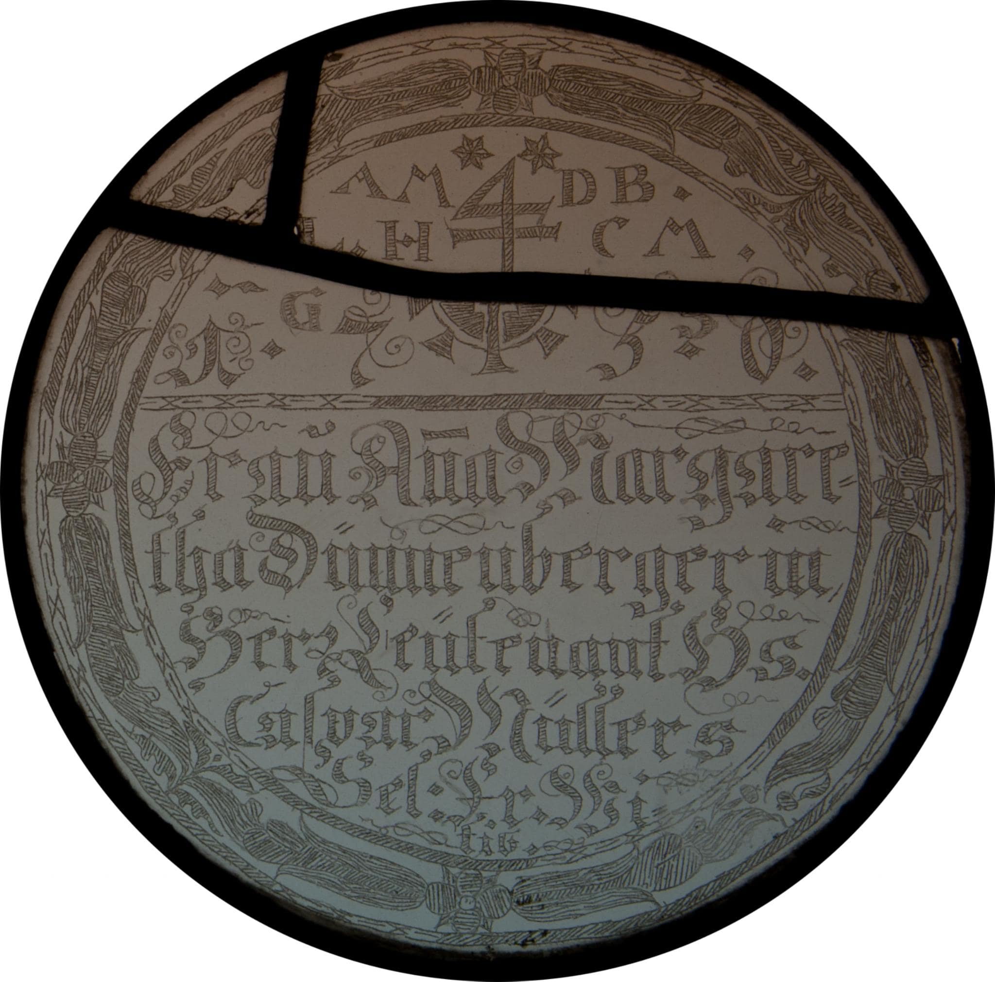 Im oberen Scheibendrittel das Wappen, die Jahreszahl sowie Initialen. Darunter die Stifterinschrift. Bordüre mit Blumenornamenten.