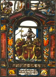 Das vor farblosen Grund gesetzte Vollwappen Keller umfasst eine mit Blattranken dekorierte, auf einem niedrigen gefliesten Podium stehende Bogenrahmung. Ihr vorgelegt sind zwei rostbraune, einen roten Flachbogen tragende Aussenpfeiler. Die Inschrift in der ergänzten Tafel an der Stirnfront des Podiums bezieht sich auf die Bibelstelle Lukas 10, 25–37 (“Liebe deinen Nächsten wie dich selbst”). Im Gegensatz zur analog komponierten Scheibe mit der Darstellung Samsons im Oberbild lassen sich hier die beiden Szenen im Oberlicht damit jedoch nicht in Verbindung bringen. Davon zeigt diejenige rechts Jakob, der auf Bitte Esaus diesem für dessen Erstgeburtsrecht von seinem Linsengericht zu essen gibt (1. Mose 25, 27–34). Die betreffende Szene, die in identischer Form ebenfalls im rechten Obereck der Wappenscheibe Gideon Scherbs (TG_1450) erscheint, beruht auf dem Kupferstich der Bilderbibel Matthäus Merians des Älteren. Was genau im linken Obereck festgehalten ist, lässt sich aufgrund der Sprungbleie nicht mehr erkennen (attackierender Hund?).
