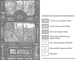 Nur das Hauptbild ist original. An dieses fügen sich zahlreiche neue Ergänzungen und alte Flickstücke. Sprungbleie; die Verbleiung erneuert.