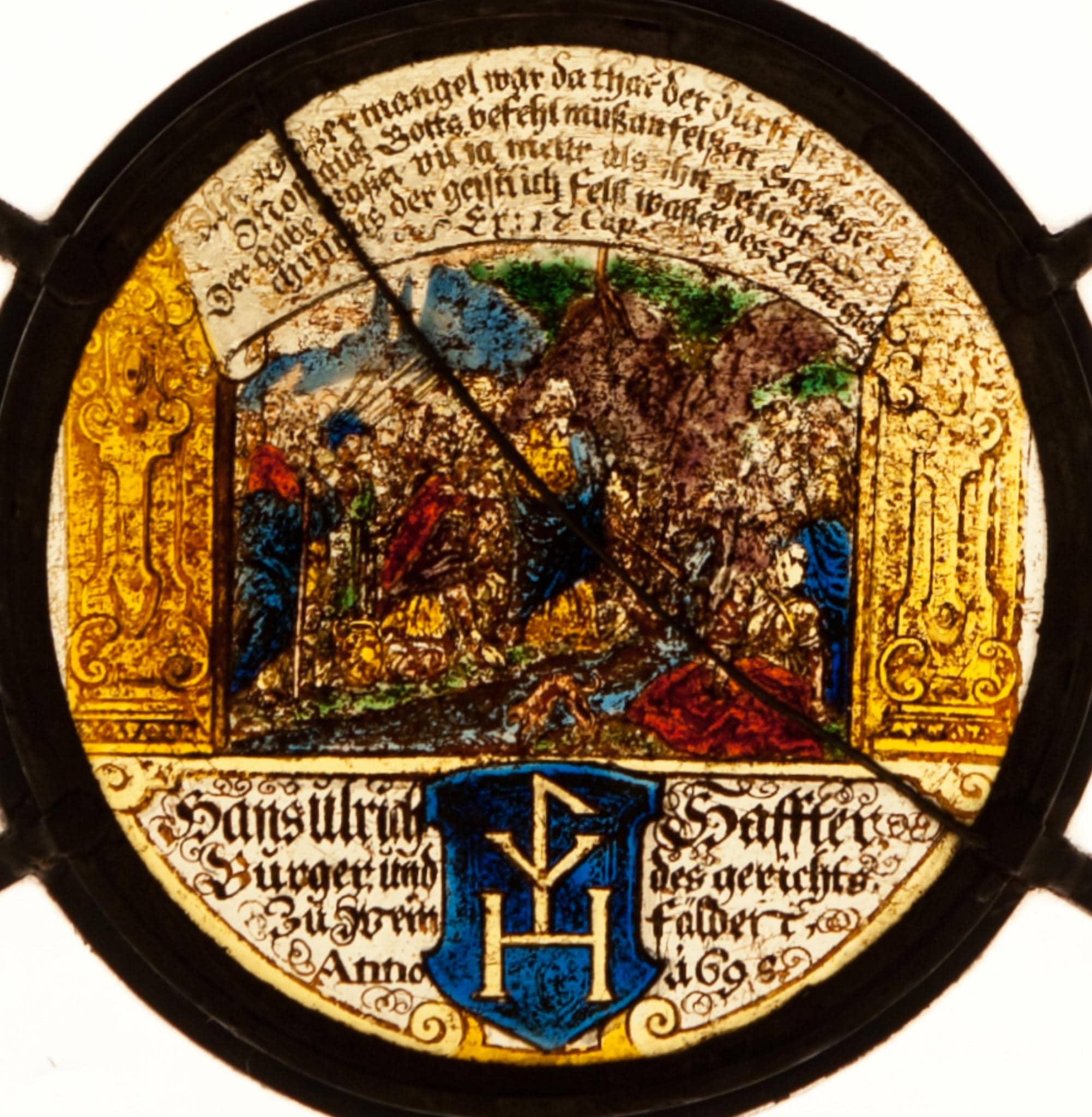 Runde Bildscheibe Hans Ulrich Haffter mit dem Wasser aus dem Felsen schlagenden Moses