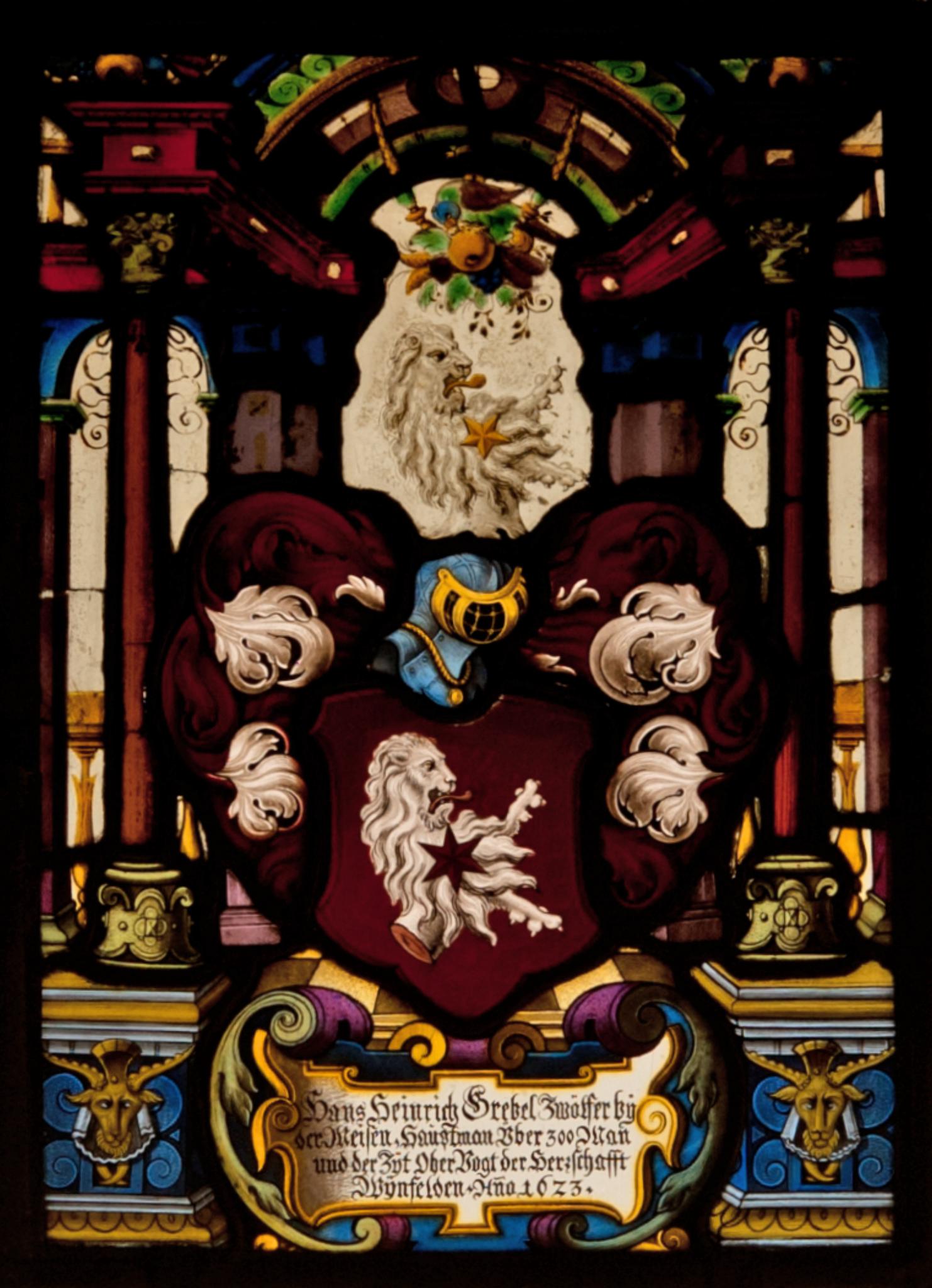Die ganze Fusszone mit der Inschrift und das Wappen der vorliegenden Scheibe ist (wohl richtig) ergänzt. Dennoch lässt sie sich aufgrund der Komposition und der Gestaltung des Helmzier-Löwen als Werk Hans Jakob I. Nüschelers einordnen. Der Sohn Hans Jakob II. (1614–1658) war damals noch zu jung. Ähnlich komponiert und aus derselben Werkstatt stammend sind die beiden Scheiben Hans Bergers (der Nachfolger Grebels als Obervogt von Weinfelden) und Melchior Maags von 1632 (TG_1453, TG_94). Grebel stiftete die Scheibe wohl anlässlich seiner Ernennung zum Obervogt von Weinfelden im Jahr 1623.