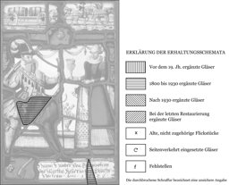 Drei kleine neue Ergänzungen in der Figur des Stifters und der Inschrift; Sprünge und Sprungbleie; die Verbleiung erneuert.