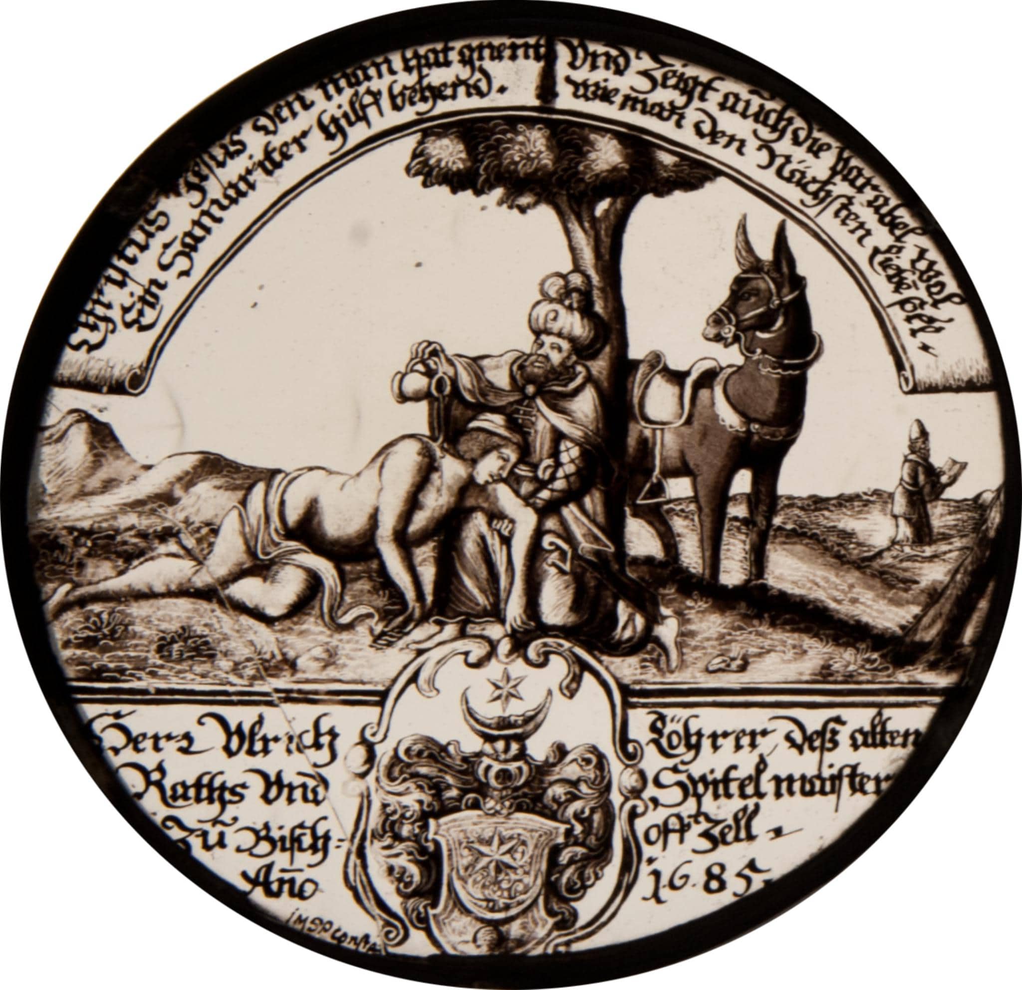 Das Hauptbild zeigt den von seinem Pferd gestiegenen Barmherzigen Samariter, der unter einem Baum den am Boden liegenden, ausgeraubten und entkleideten Mann stützt und ihm aus einem Becher kühlendes Wasser über den Kopf giesst. Die Szene wird am oberen Rand von einer Schriftrolle mit der Bildlegende umfasst. Das untere Scheibendrittel füllen die Stifterinschrift und das in ihrem Zentrum befindliche, von einem Blattkranz in Rollwerkform umrahmte Vollwappen Ulrich Löhrers.