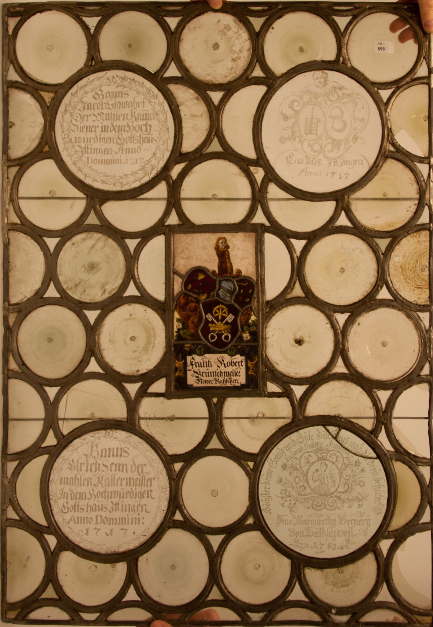 Die Schliffscheibe ist in mit drei weiteren Schliffscheiben sowie einer farbigen neuzeitlichen Wappenscheibe in ein Butzenfenster eingebaut.