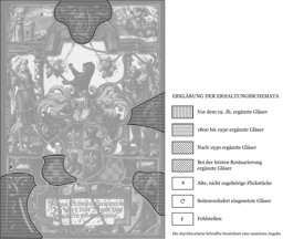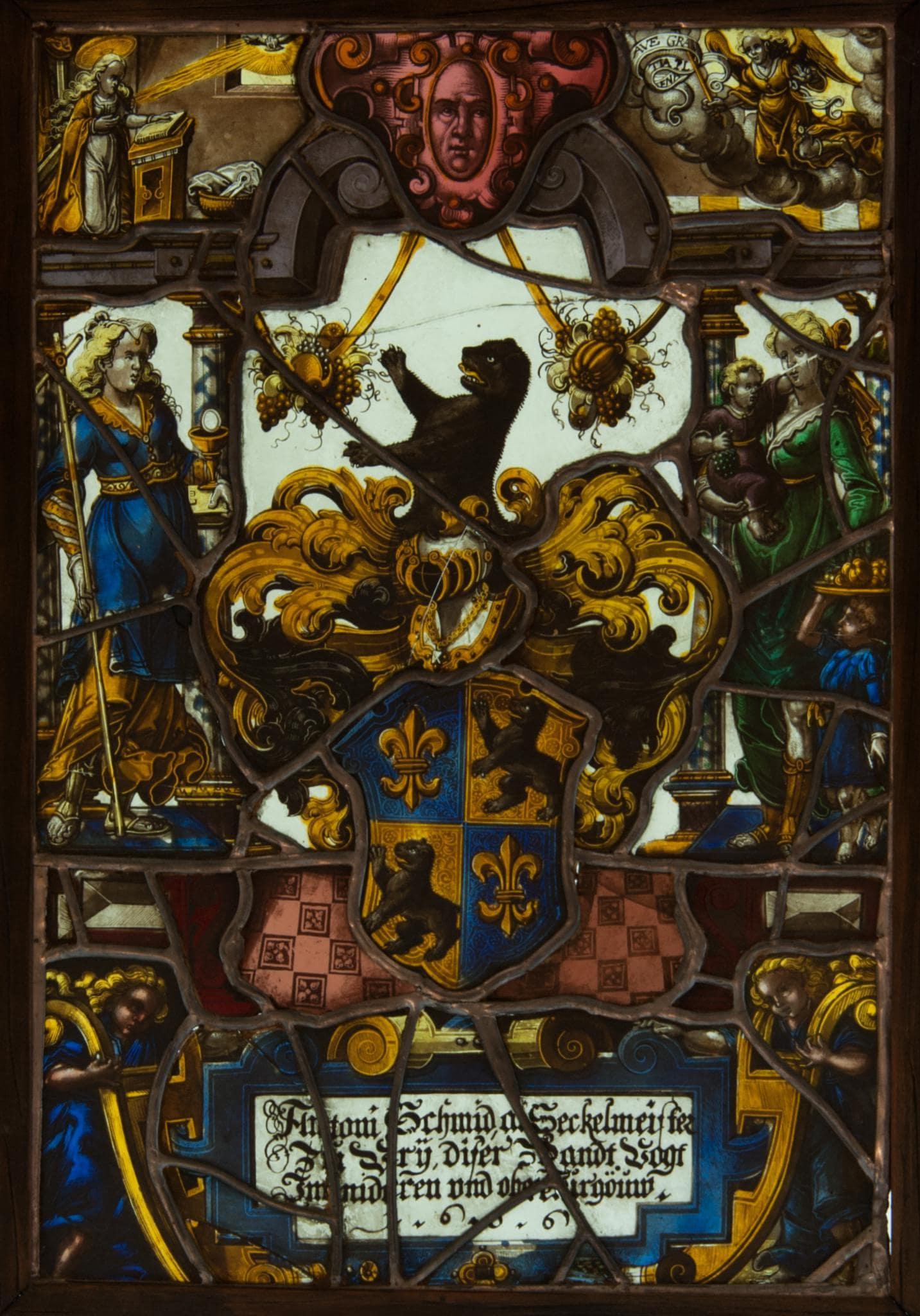 Das Vollwappen Anton Schmids steht über der blau-gelben Inschriftenkartusche, welche zwei Putten vor dem mit Fliesen belegten Podium halten. Dahinter erhebt sich vor farblosem Grund eine dreiachsige Rahmenarchitektur aus vier Marmorsäulen und einem violetten Bogen mit einer erneuerten grossen Maskenkartusche am Scheitel. In den beiden Seitennischen sind als Schildbegleiterinnen zwei allegorische Frauengestalten postiert, links Fides mit Kreuz und Hostienkelch und rechts Caritas mit ihren Früchte tragenden Kindern. Das durch die erneuerte rosa Maskenkartusche in zwei Felder unterteilte Oberbild zeigt die Verkündigung an Maria. Während im rechten Feld Gabriel aus den Wolken niederschwebt, kniet im linken Maria vor dem Betpult und empfängt die Strahlen der über ihr schwebenden Taube des Heiligen Geistes.