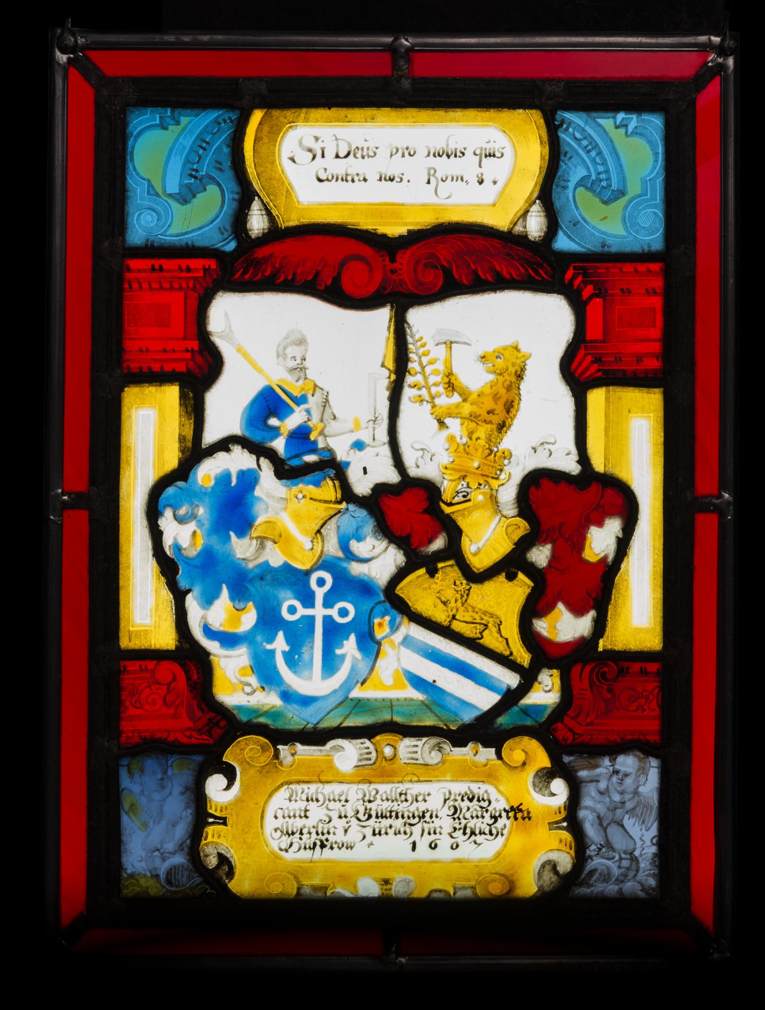 Im Zentrum erscheinen vor farblosem Grund die über die von zwei Putten gehaltene Inschriftkartusche gesetzten Vollwappen Michael Walters und Margaretha Aberlis. Sie werden von gelben Pilastern mit roten Kapitellen und Basen gerahmt. Über dem darüber befindlichen roten Rollwerkbogen ist in einer gelben Tafel ein lateinischer Bibelspruch als Devise Michael Walters festgehalten.