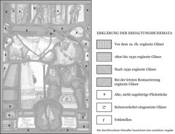 Die ganze Rahmung und das Oberbild aus alten Flickstücken zusammengestellt; einige Sprünge und mehrere Sprungbleie; die Verbleiung erneuert.