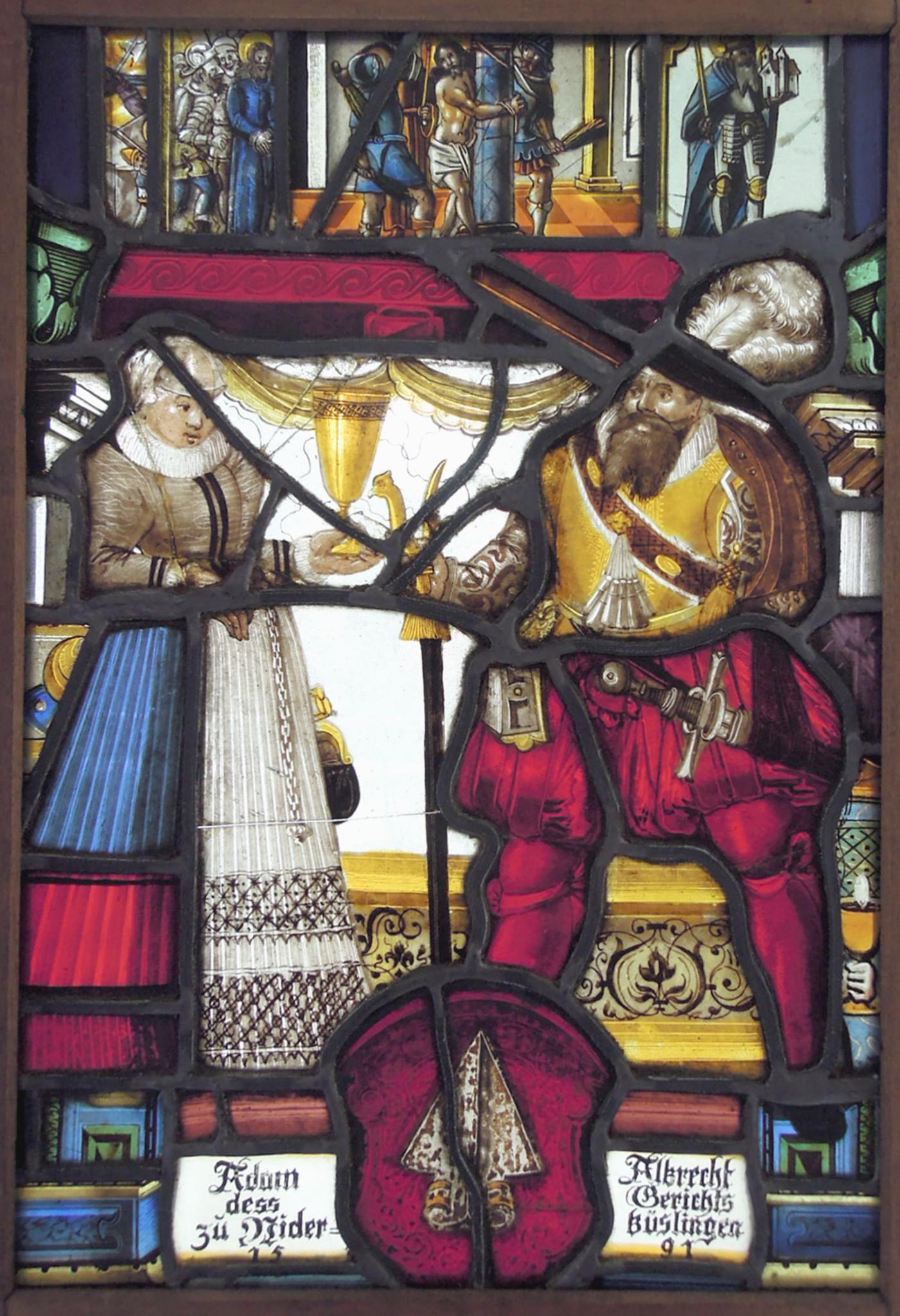 Vor farblosem, schnurverziertem Grund und einer niederen Brüstung steht sich das Stifterehepaar gegenüber. Der rechts postierte Mann in roten Beinkleidern und gelbem Wams hält in seiner Rechten die Gewehrgabel und in der Linken das geschulterte Gewehr. Zu seiner Ausrüstung gehören zudem das um die Brust gebundene Patronenbandelier sowie Schwert und Pulvertasche an seinem Gürtel. Von links reicht ihm seine Frau den Willkommtrunk in einem grossen goldenen Pokal. Sie erscheint in braunem Mieder mit Mühlsteinkragen, einem blauen Rock mit rotem Fussteil sowie weisser Schürze und Haube. Zu Füssen des Paares befinden sich das Stifterwappen und die Inschrift. Die Rahmung sowie der obere Abschluss der Scheibe mit der Gefangennahme und Geisselung Christi sowie dem hl. Heinrich II. sind aus alten Flickstücken gebildet.