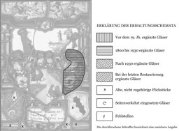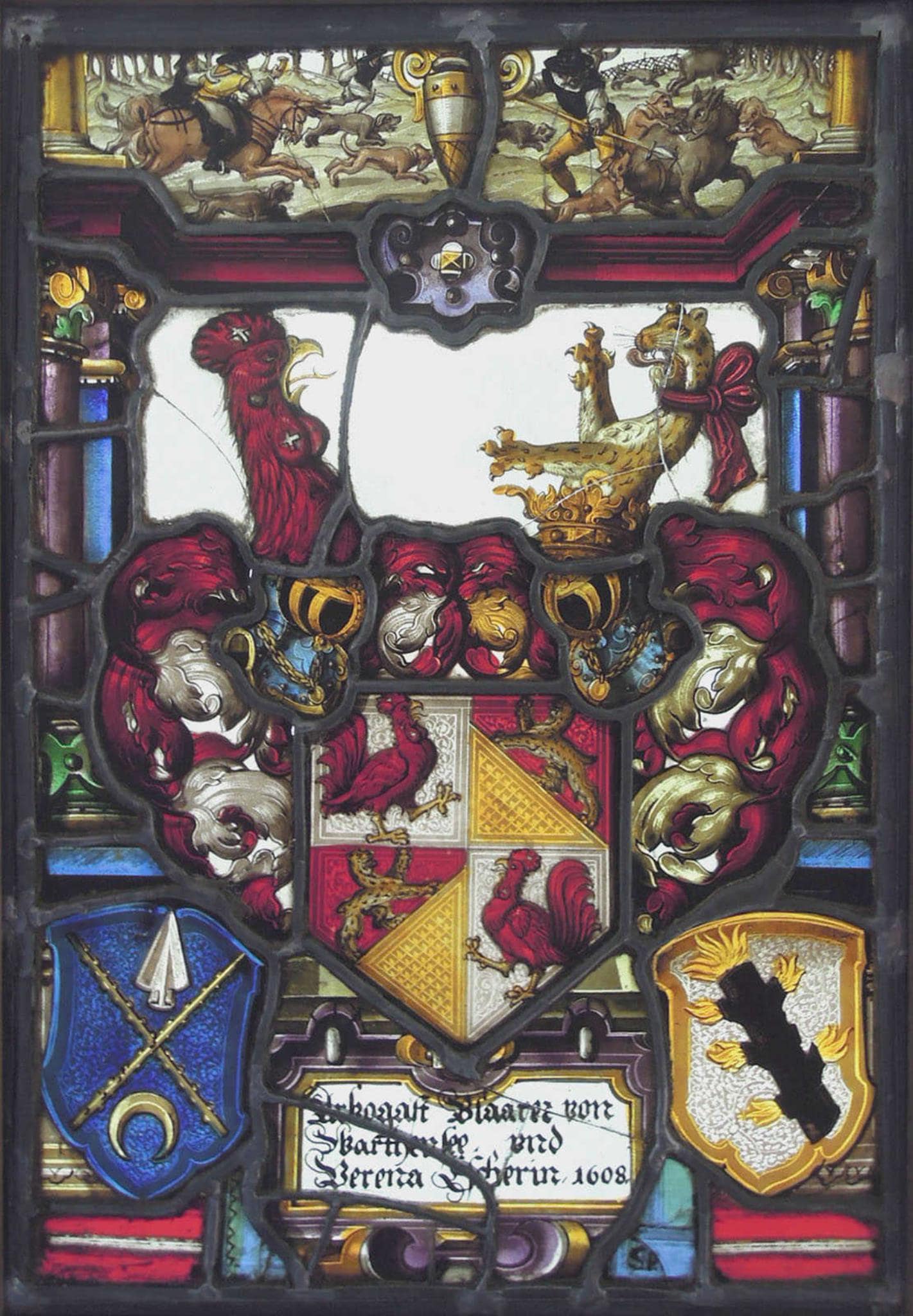 Vor farblosem Grund steht das gevierte Vollwappen der Stifter. Darunter ist die Inschriftkartusche gesetzt, umgeben von mehreren Flickstücken (darunter zwei unbekannte Wappen). Pfeiler mit vorgesetzten Halbsäulen tragen das verkröpfte Gebälk mit Scheitelkartusche. Im Oberbild ist eine Wildschweinjagd dargestellt.