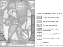 Vor gelbem Damastgrund steht der ein rotes Banner mit Schwert haltende bärtige Stifter neben seinem Wappenschild. Er ist in rote Beinkleider, ein blaues Hemd, ein schwarzes, weiss gestreiftes Wams sowie einen schwarzen Federhut gekleidet. Auf dem blau gefliesten, den Stifternamen enthaltenden Podium am Scheibenfuss erheben sich die mehrfarbigen, einen Flachbogen tragenden Rahmensäulen. Der linke Teil des Oberbildes zeigt zwei Männer auf einem Dorfplatz mit Wirtshaus und der rechte zwei Männer auf einer Brücke, wovon der eine Gegenstände aus einem Sack ins Wasser schüttet.