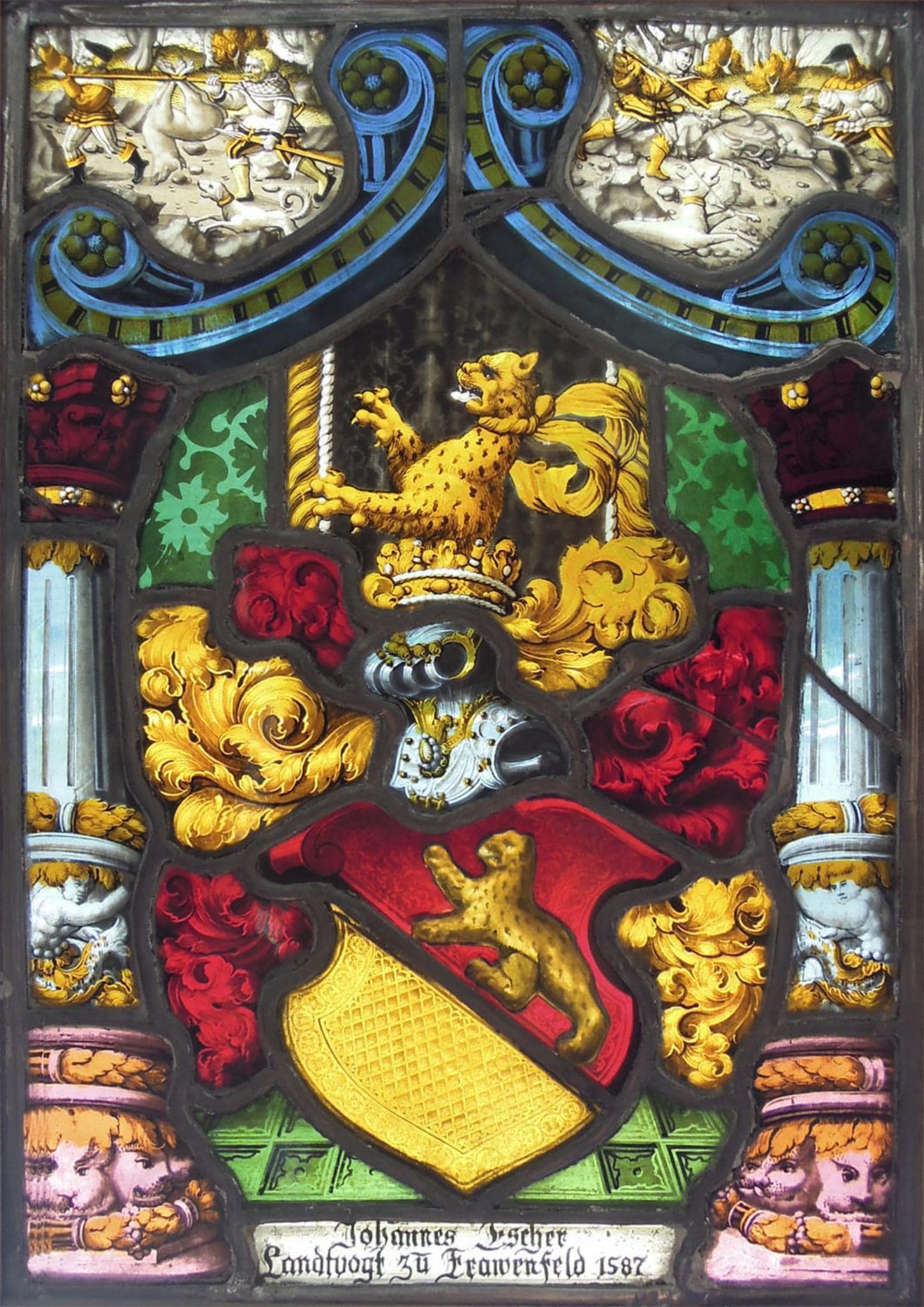 Die Wappenscheibe trägt die ergänzte Inschrift “Johannes Escher / Landtvogt zu Frawenfeld 1587”. Der Stil und die Motive des Glasgemäldes, so der Damasthintergrund, die architektonische Rahmung und insbesondere der Fliesenboden, sprechen jedoch für eine wesentlich ältere Entstehungszeit der Scheibe in den 1530er bis 50er Jahren. Als Vergleichsbeispiele lassen sich die Scheibe des Wilhelm von Bernhausen 1543 (Helbing, 1914, Nr. 129, Abb. Taf. 8), des Sebastian von Muntprat 1542 (Eremitage, St. Petersburg, Shlikevich, 2010, Nr. 4), die zugehörige Scheibe des Ludwig von Ulm 1542 (TG_287), des Hans Wirz 1532, Balthasar Spentziger 1533 (beide Schweizerisches Nationalmuseum, Schneider, 1971, Bd. 1, Nr. 197, 200) oder der Stadtscheibenzyklus von 1542/43 im Rathaus von Stein am Rhein (Hasler, 2010, Nr. 154–159)anführen.