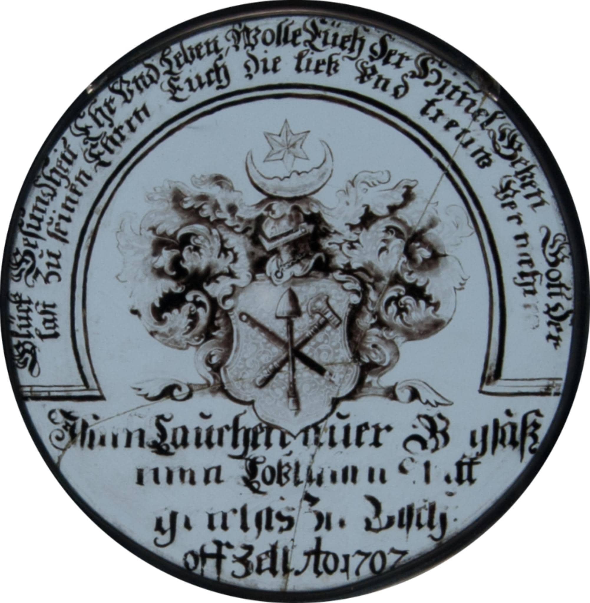 Im Zentrum der Rundscheibe befindet sich das Vollwappen von Isaak Lochenauer (Lauchenauer). Während dieses oben halbkreisförmig eine zweizeilige Legende umfasst, ist unterhalb von ihm die Stifterinschrift angebracht.