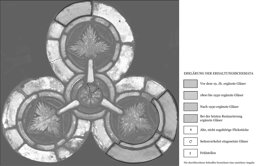Die hellblauen, gelben und stellenweise auch die weissen Gläser sind aussenseitig von einem feinen punktförmigen Lochfrass überzogen. Das rote und grüne Glas erweist sich hingegen als weniger korrosionsanfällig. Vereinzelt ist eine rötlich-braune Färbung der weissen Randgläser (durch Rostbildung?) festzustellen. Die Leuchtkraft der Gläser ist ausserdem durch innenseitige Schmutzablagerungen (Russ?) gemindert, die das fleckige Erscheinungsbild der Scheibe bewirkt. Mehrere Randstücke sind geflickt bzw. ergänzt. Die offenbar zu hell ergänzten hellblauen Bänder des rechten Passlappens wurden in jüngster Zeit durch rückseitig applizierte Papierstreifen gedämpft. Zwei Sprünge in der roten Blüte und in einem Randglas. Kratzspuren. Überwiegend altes Blei.