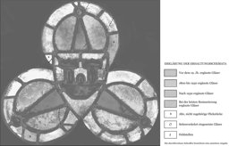 Innenseitig ist auf den messinggelben Gläsern im Auflicht stellenweise ein weisslicher Belag zu erkennen. Grosse Teile der Glasaussenseite sind mit einem weisslichen bis grünlichen (organischen?) Korrosionsprodukt überzogen. Die Leuchtkraft der Gläser ist durch innenseitige Schmutzablagerungen (Russ?) beeinträchtigt. Die Randstreifen wurden geringfügig ergänzt. Mehrere Sprünge im Schild und im Randbereich. Kratzspuren. Die Scheibe ist neu verbleit.
