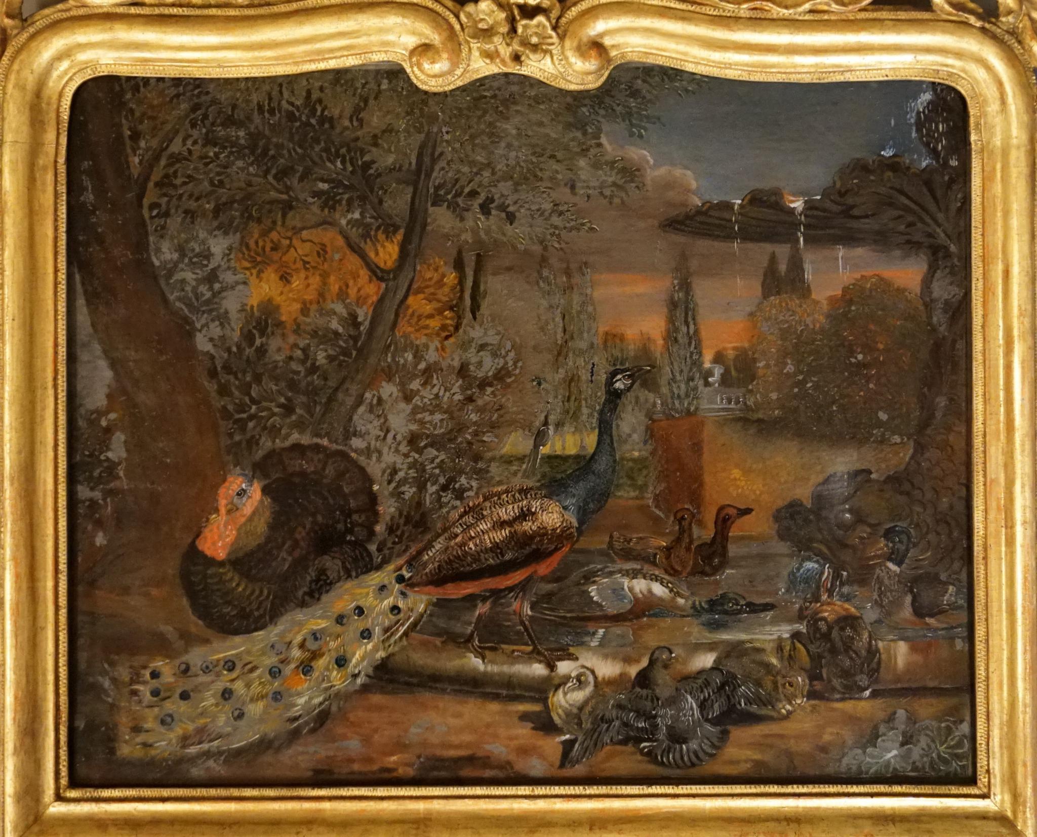 Dieses Hinterglasbild stellt eine Parklandschaft mit einem Brunnen dar, der aus zwei übereinanderstehenden Wasserschalen besteht. Das Wasser entspringt den Nasenmündungen eines Delphins. Um den Brunnen halten sich verschiedene Tiere auf: ein Truthahn, ein Pfau, ein Taubenpaar und zwei Hasen. Vier Enten schwimmen im unteren Wasserbecken. Im Hintergrund erkennt man verschiedene Baumarten und eine Steinmauer.