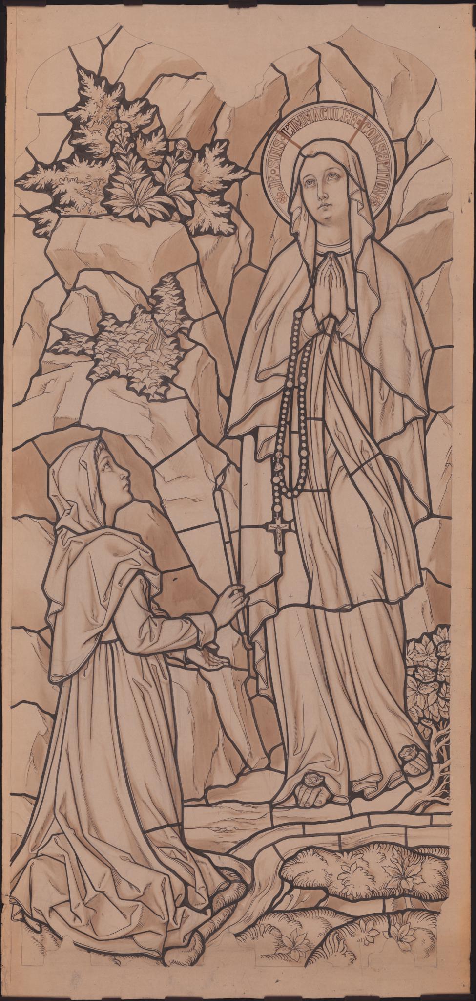Ce carton est parfaitement identique au vitrail, à l’exception de la faute d’orthographe sur l’inscription présente sur le nimbe de la Vierge : “Je suis l’Immaculée conseption” qui a été corrigée sur le vitrail. Seule la partie centrale figurée est représentée sur le carton, avec la forme de la découpe de la bordure. L’encadrement architectural a fait, comme fréquemment, l’objet d’un carton séparé qui a également été utilisé pour l’encadrement identique du second vitrail du choeur consacré à l’Apparition du Christ au Sacré coeur à sainte Marguerite-Marie Alacoque.