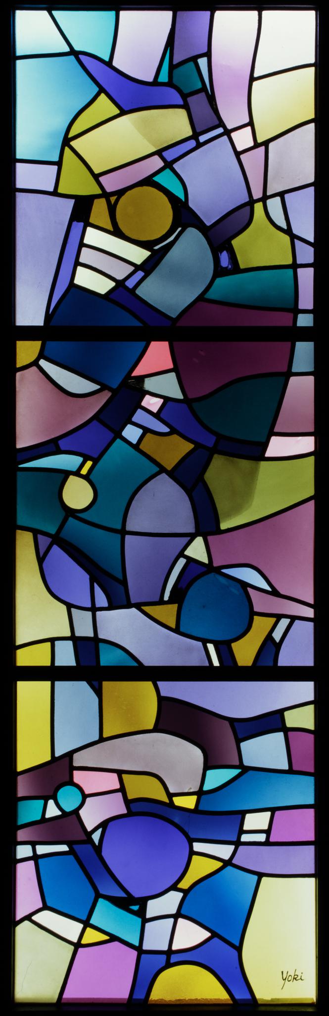 Yoki a réalisé de très nombreux vitraux abstraits autant pour le domaine religieux que profane, dans la technique du vitrail au plomb et celle de la dalle de verre. Généralement, il conçoit ses oeuvres sans grisaille, jouant avec les lignes et les couleurs selon une pondération subtile, et invite la nature environnante à interagir avec son oeuvre pour offrir des jeux de lumière toujours changeants et mouvants.