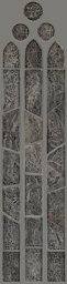 Les panneaux étaient montés dans les feuillures de l’embrasure et des meneaux verticaux de la fenêtre et scellés avec du ciment rapide. Le poids des panneaux était probablement supporté par des barres d’armature passant dans les rainures réalisées dans les bords inférieurs et supérieurs de chaque panneau. Les barres de fer avaient un diamètre d’environ 5 mm et étaient enrobées dans du mortier de ciment, probablement ancrées des deux côtés dans la maçonnerie. Il n’en reste que les traces de rouille dans le mortier de pose. Des empreintes dans le mortier de pose suggèrent que les panneaux étaient tenus par des feuillards à l’intérieur.