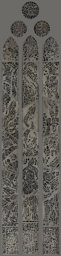 Vitrail tripartite monumental d’environ six mètres de haut et de deux mètres de large composé de 24 panneaux, dont 21 étaient installés dans les trois lancettes en arc brisé et trois dans les occuli des remplages de la baie centrale du chœur de l’église. Le vitrail a été démonté en 1978 (voir historique de l’œuvre) ; les 24 panneaux sont aujourd’hui conservés aux archives du couvent.