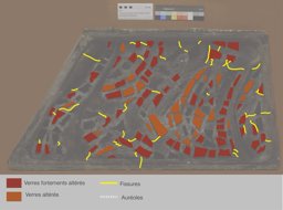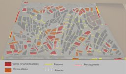 Tous les panneaux montrent des fissures d’épaisseurs variables d’environ 0.1–0.5 mm. Elles sont réparties de manière uniforme sur toute la surface et passent généralement entre les angles de verres adjacents. La plupart des fissures se manifestent sur la face externe du panneau. Elles semblent être superficielles. Ces fissures sont probablement apparues lors de la prise du béton et ne constituent pas de danger pour la conservation de la dalle de verre. Certaines fissures sont traversantes ; elles sont principalement visibles sur la face interne des panneaux et se situent majoritairement à proximité des bords et entre les verres très altérés.