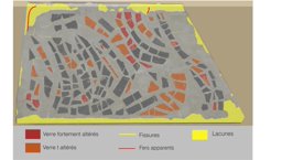 Les bords des panneaux sont très endommagés à de nombreux endroits. Le béton y présente des éclats et des pertes ; les fers y sont souvent exposés et corrodés. Sur la face interne des panneaux, les fers apparents sont rares ; leur apparition est liée d’une part au faible enrobage, d’autre part à l’éclatement superficiel du béton, qui génère à son tour la corrosion des fers proches de la surface. Un léger écaillage du béton peut être également observé dans les zones autour des verres très altérés de couleurs jaune, orange et rouge (voir ci-dessous). Il est essentiellement en lien avec la dégradation de ces verres peu stables et la formation de sels. L’efflorescence de sels est particulièrement visible et plus marquée sur la face externe, où elle forme des auréoles concentriques autour des verres. Sur la face interne, l’efflorescence de sels se manifeste par un voile blanc en surface.