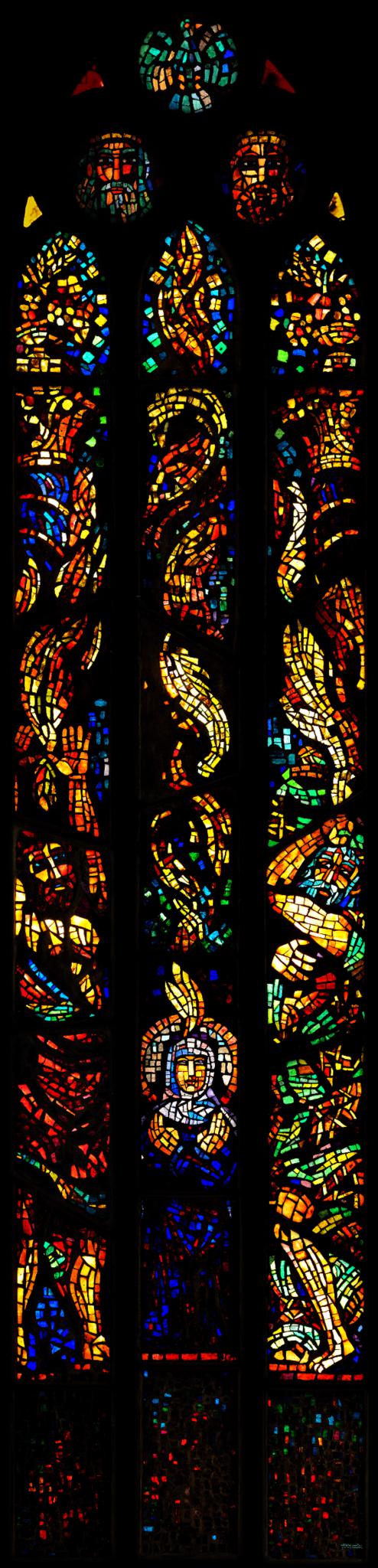 DV_1: Vue intérieure du vitrail en technique de dalle de verre de la Pentecôte d'Alexandre Cingria en lumière transmise.
